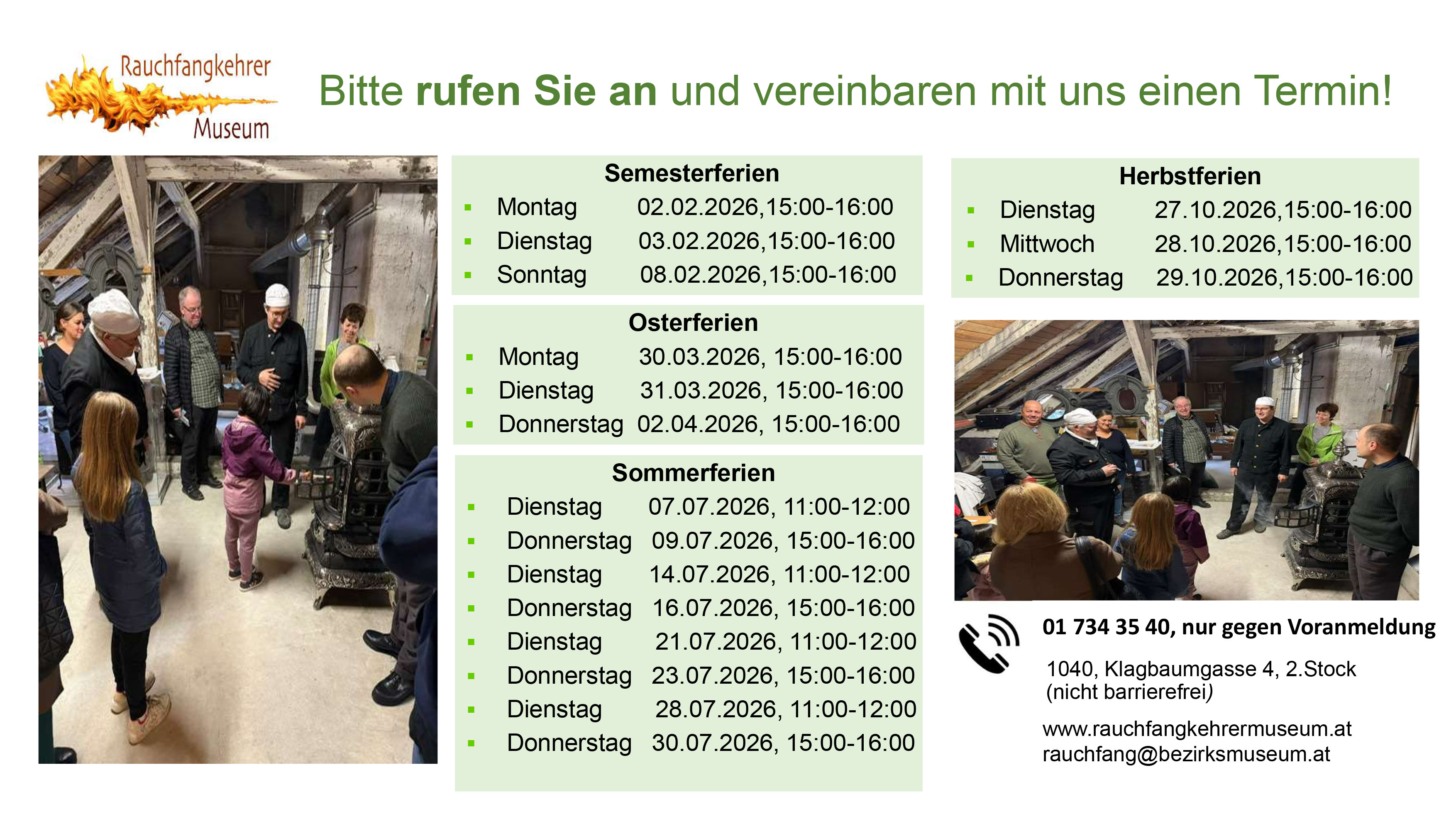 Museumsleitung Tel. 01/734 35 40 Mo.-Fr. 8:00-13:00 Email: rauchfang@bezirksmuseum.at oder office@rfkstern.at